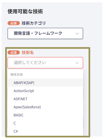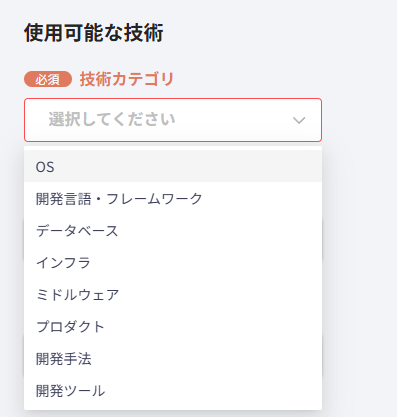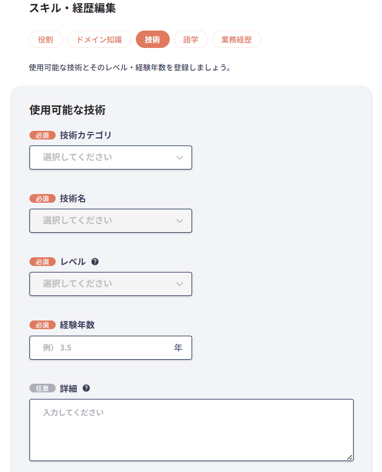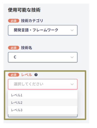 技術カテゴリごとに技術を選択し、レベルを設定します。